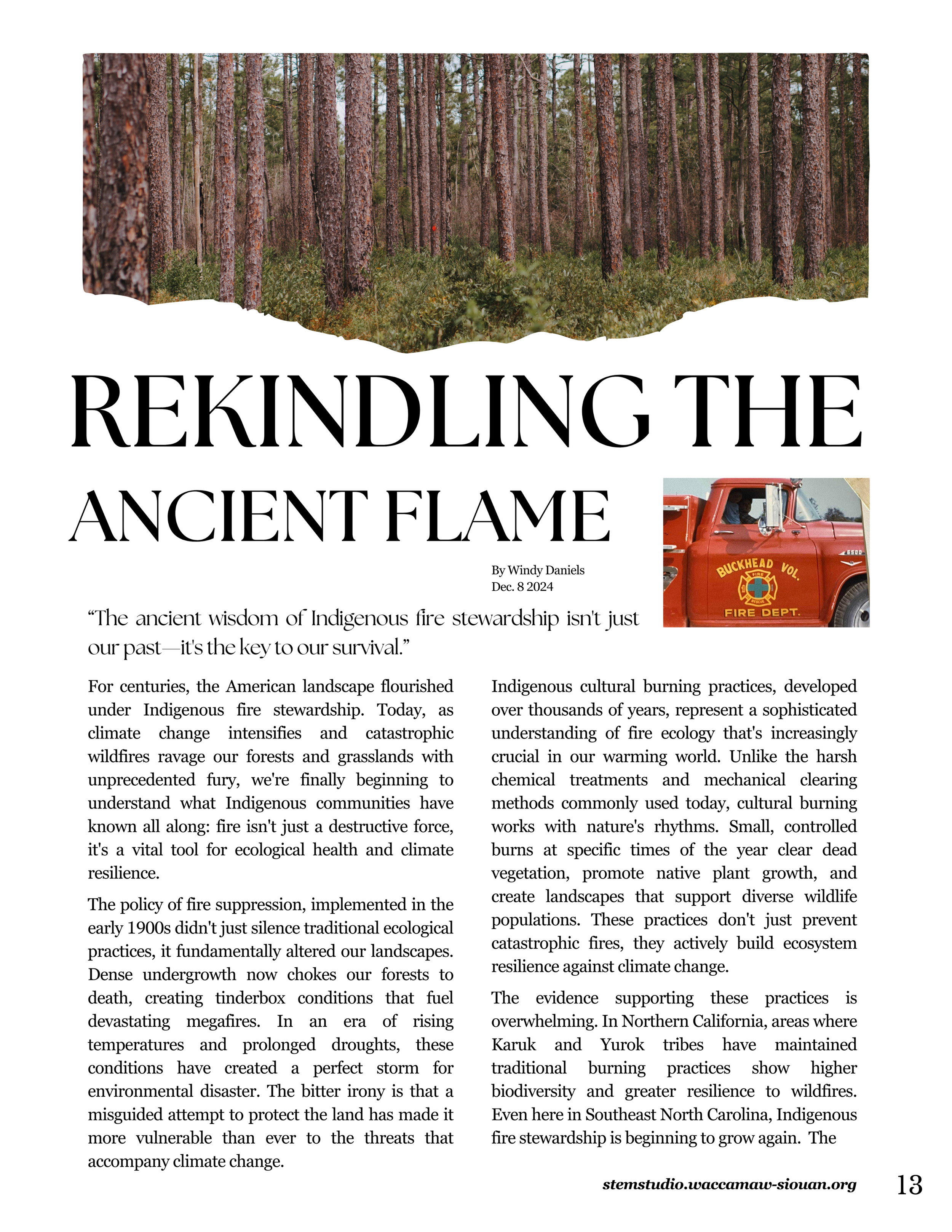 Through publications, articles, and educational materials, the Hooheh Program’s story is shared with the wider community — weaving together history, environmental science, and Indigenous knowledge. I created written pieces that educate the public about cultural burning practices, the importance of reforestation, and the ways ancestral knowledge can guide modern conservation efforts. Each written work serves as a bridge between generations, honoring the past while inspiring action for the future.
