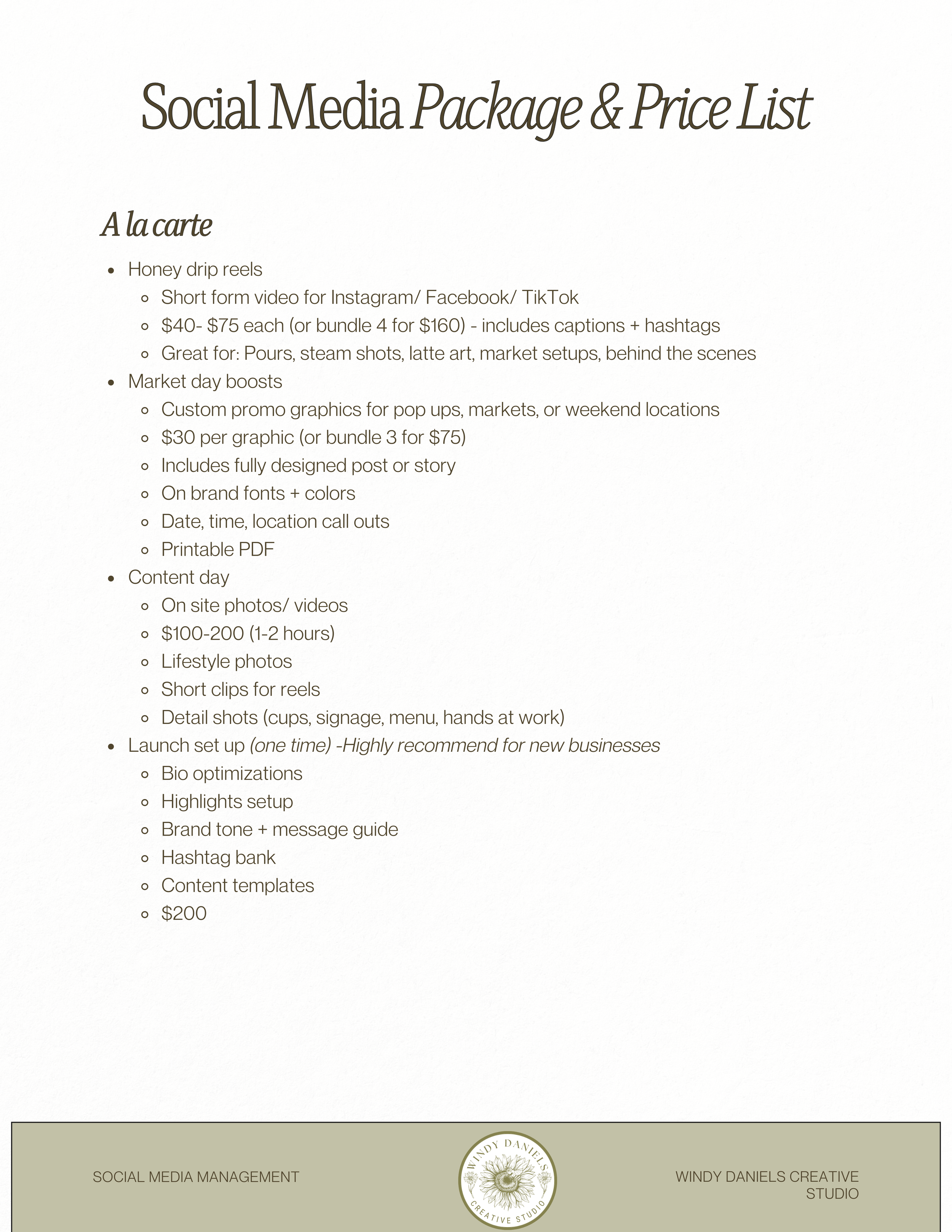 My approach is rooted in connection, creativity, and clarity. Whether you’re a weekend coffee cart, a local shop, or a growing brand finding its footing, I meet you where you are and build a social presence that feels natural, intentional, and aligned with your values.